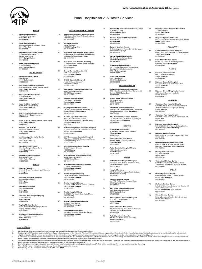 Dalam gambar di atas adalah list hospital panel aia di mana kemasukan ke hopsital ini hanya dengan menggunakan medical card aia. Just present your sihat malaysia card at any panel healthcare providers nationwide for easy admissions. .ever, aia malaysia customers can easily manage their insurance & takaful plans, make cashless visits to any aia panel of medical providers • locate aia panel clinics & hospitals/aia platinum make healthier choices with aia vitality • check your aia vitality points and status on the go • view. Here is the list of prudential's panel hospitals and healthcare centers around malaysia. I have added the clinic details below.