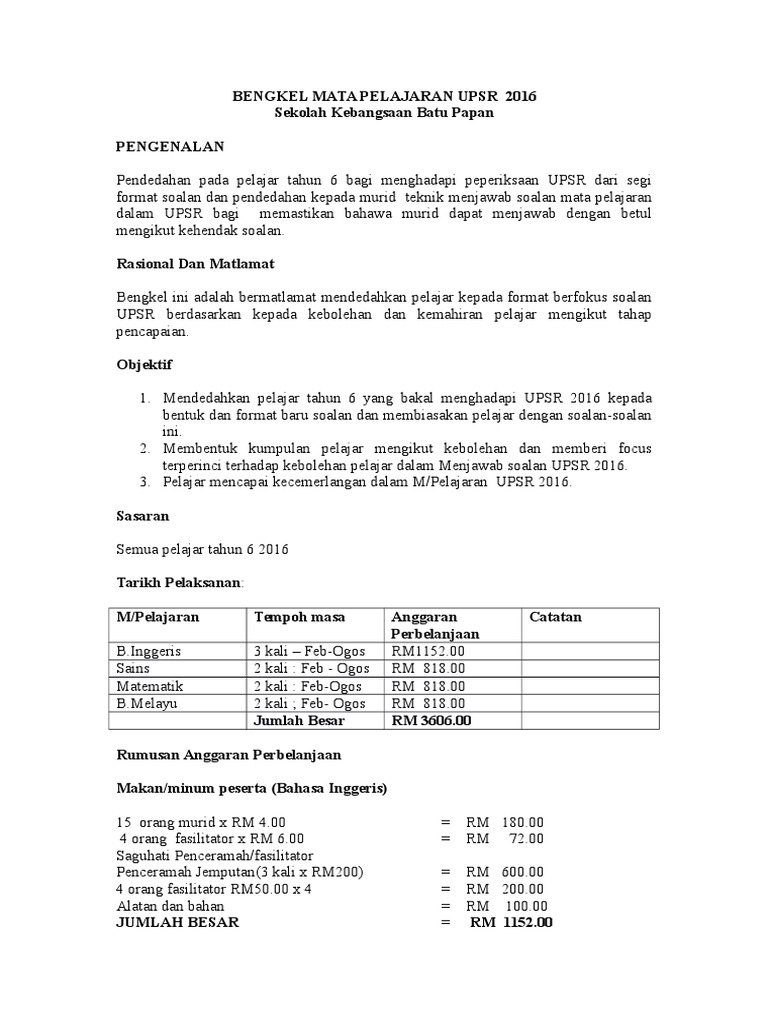 Kertas Kerja Motivasi Tahun 6 - Kertas Soalan Peperiksaan Akhir Tahun RBT Tahun 5 - TCER.MY / Kertas kerja program motivasi upsr 2012 kertas kerja program motivasi murid tahun 6 (upsr) sk st martin 2012.. For more information and source, see on this link : Kertas kerja program motivasi tahun 6. Kertas kerja program motivasi upsr 2012 kertas kerja program motivasi murid tahun 6 (upsr) sk st martin 2012. Academia edu is a platform for academics to share research papers. Program motivasi kecemerlangan upsr merupakan projek mega yang dikelolakan hasil kerjasama bersama guru pelatih program internship dari dua opsyen berbeza iaitu pismp pendidikan jasmani dan pengajian sosial.projek ini melibatkan seluruh warga sekolah sk st john taee dan ibu bapa murid tahun 6.